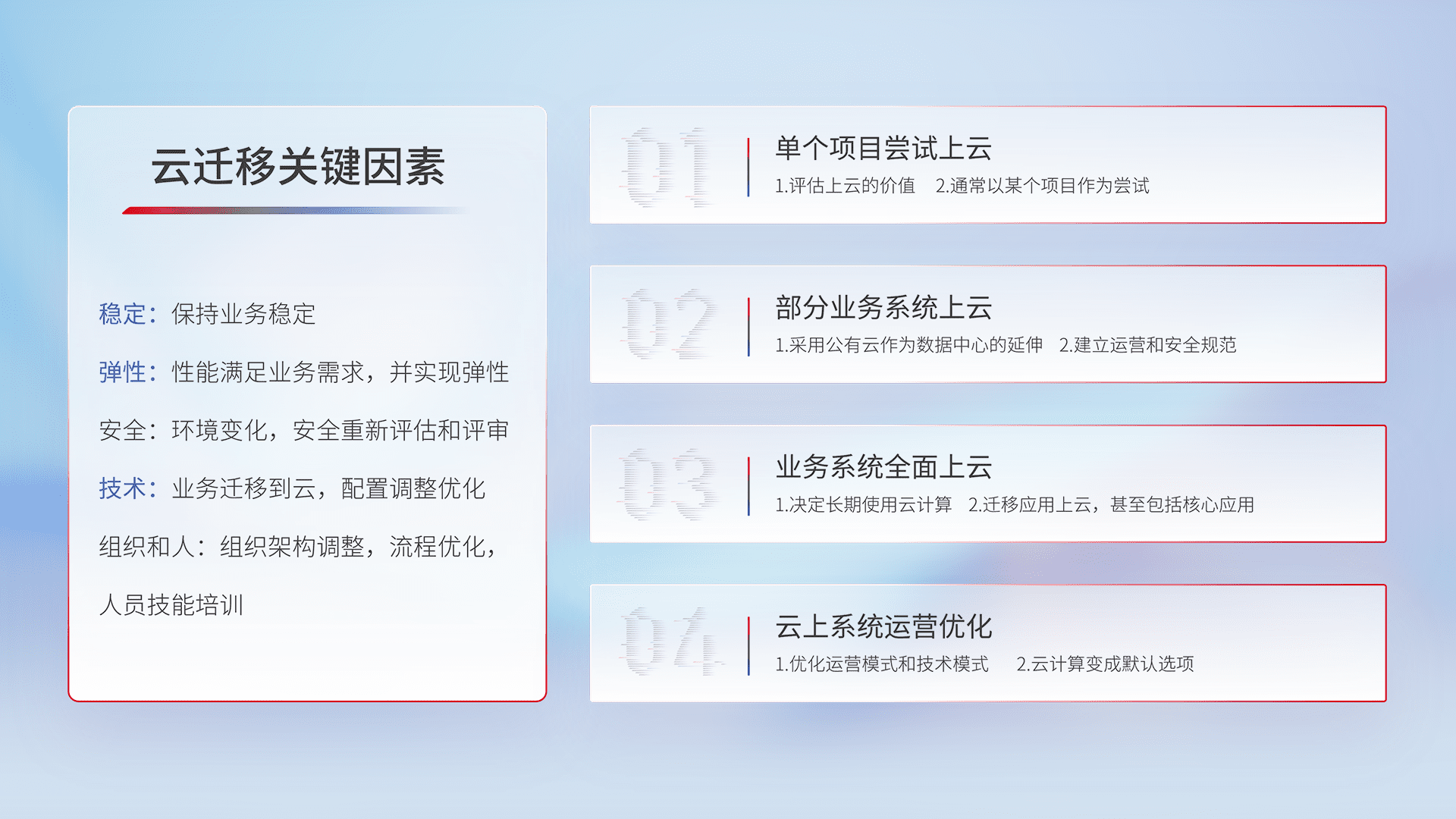 结合实际业务,,从规划设计、、云平台选型、、、云原生改造、、、数据迁移、、集成交付,,迁移全过程为客户识别最佳上云路径,,,,做好风险识别管理,,,,设计网络架构、、、、身份权限、、、安全审计合规、、操作审计、、、、日志审计、、监控告警策略、、多站点容灾设计等,,,对云上基础设施进行整体规划,,提升IT治理水平,,以满足弹性、、、、高可用、、、高性能的需求。。