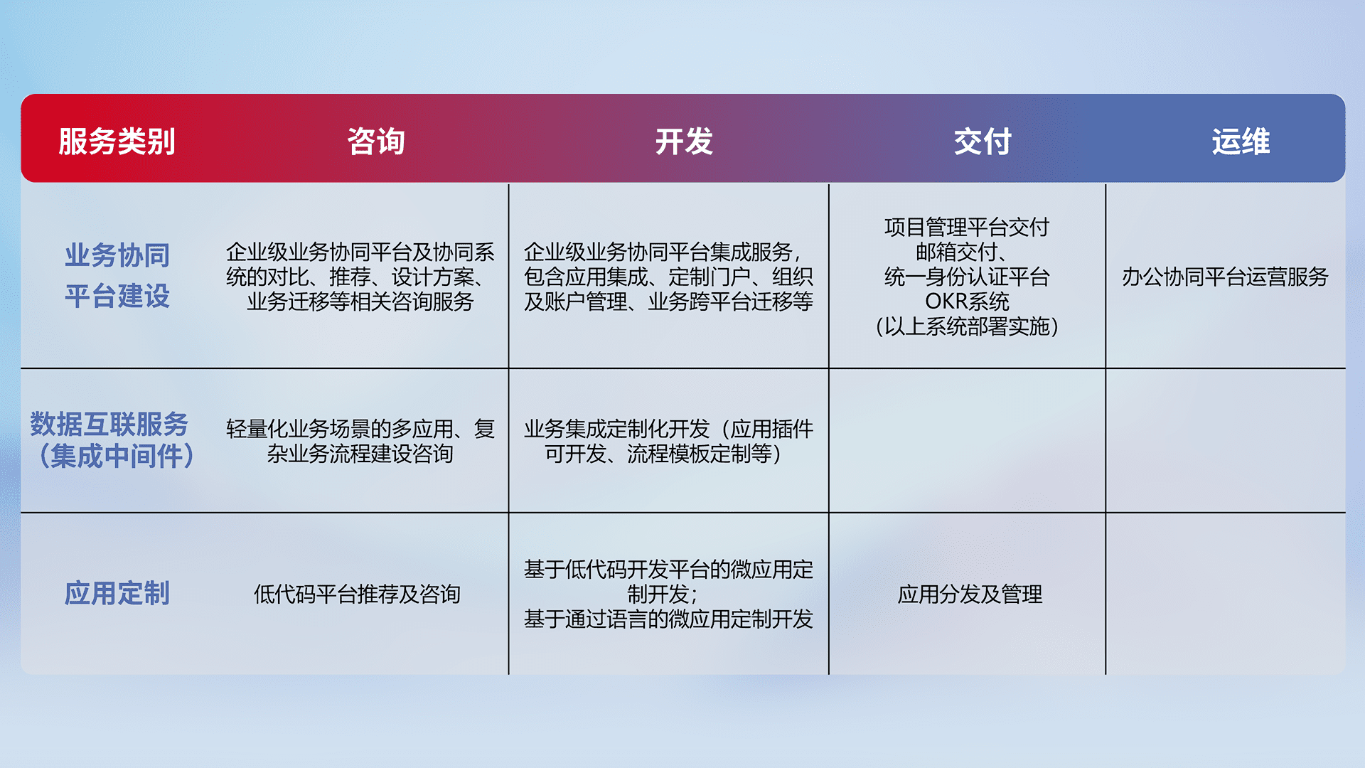 针对钉钉、、企微、、、、IDaas等平台级产品提供产品的规划、、、方案、、交付、、定制化开发等服务,,,实现如统一协同办公、、智能客户服务、、、、混合会议管理、、、、智能数据查询、、等业务场景,,,实现数字化转型。。。。
